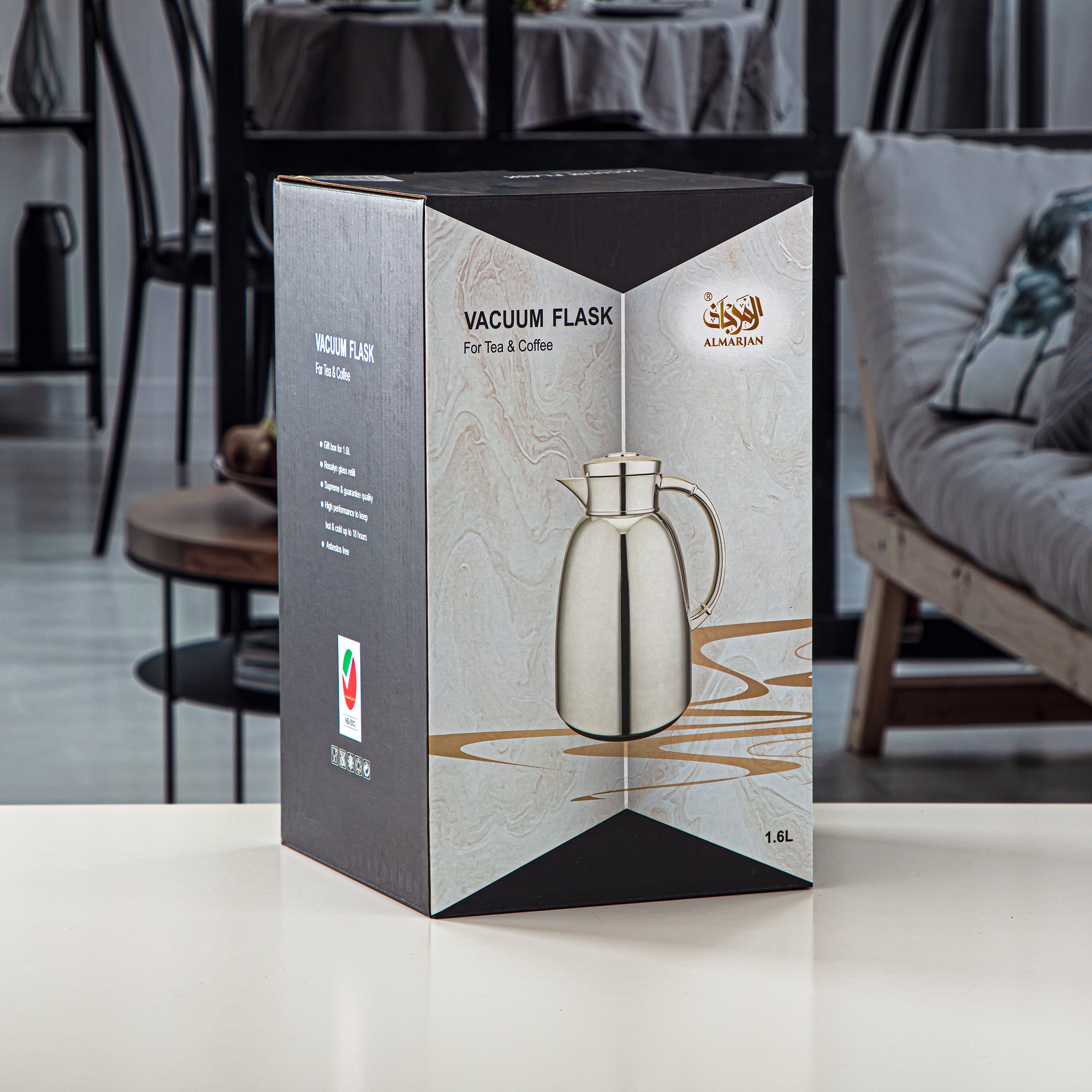 استمتع بقمة الفخامة والراحة مع دورق المرجان الفضي سعة 1.6 لتر. تتميز هذه القارورة المتطورة ببطانة زجاجية معزولة وغطاء بزر ضغط لضمان الحفاظ على مشروبك الساخن أو البارد المفضل بشكل مثالي طوال اليوم. تذوق النكهة المثالية ودرجة حرارة مشروبك مع هذه القارورة الفاخرة حقًا.