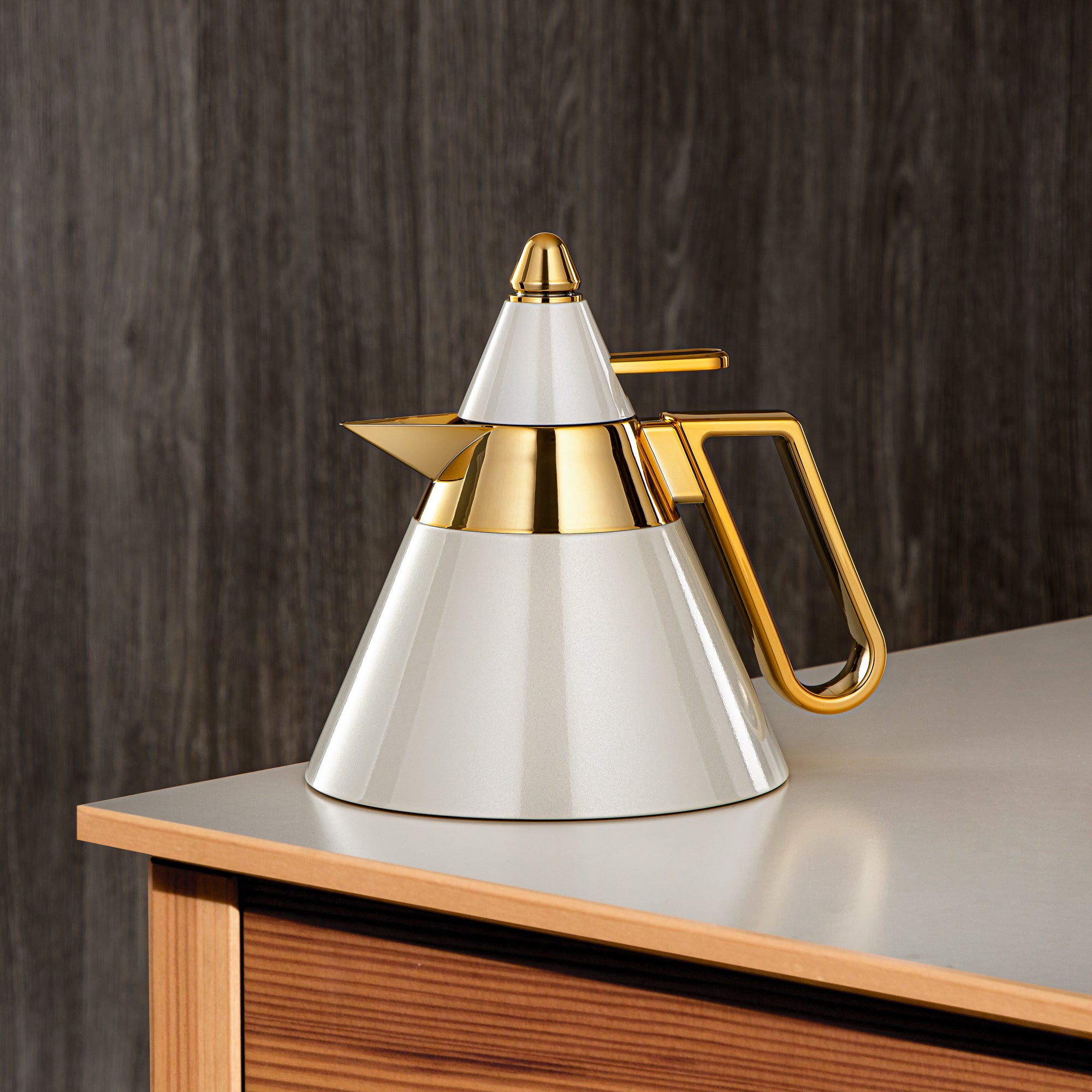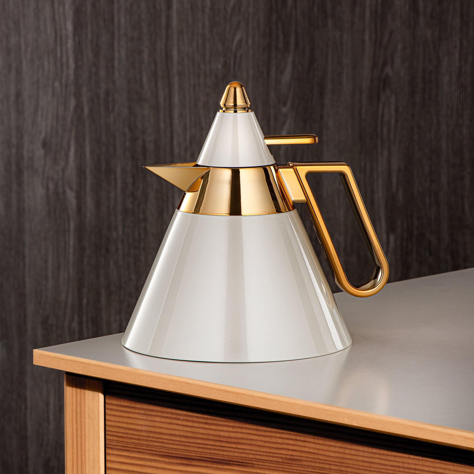 Almarjan Vacuum Flask 1.6L (QVC-1600Q265YZC95) - Push Button, Stone Grey & Gold | Modern Serveware